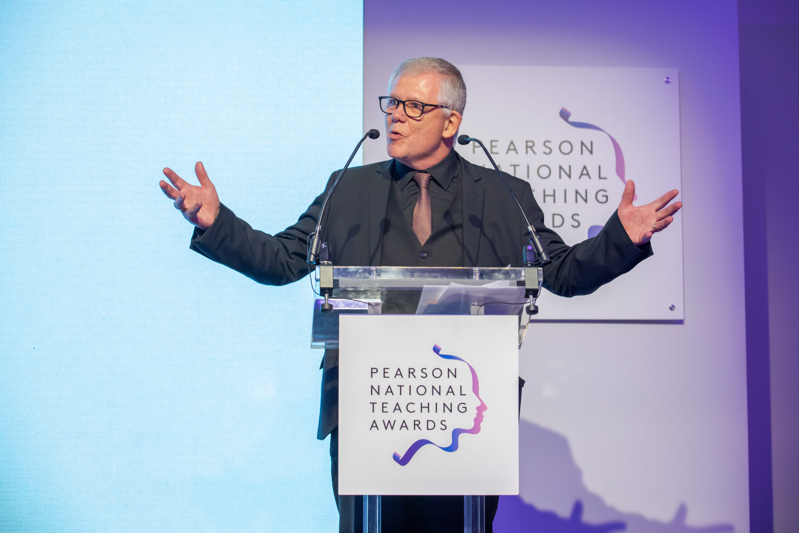 A gray-haired man in glasses speaks passionately at a clear podium, hands outstretched. Behind him are signs for the Pearson National Teaching Awards. He's wearing a dark suit and tie against a blue and purple backdrop. James Gifford-Mead Photography - Event Photographer London awards photography